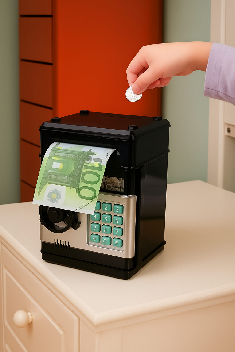 Elektroniczny bankomat–sejf dla dzieci to świetny sposób na naukę oszczędzania w formie zabawy! Skarbonka przyjmuje monety i banknoty, a dostęp chroniony jest kodem PIN, co sprawia, że dziecko czuje się jak właściciel prawdziwego sejfu.