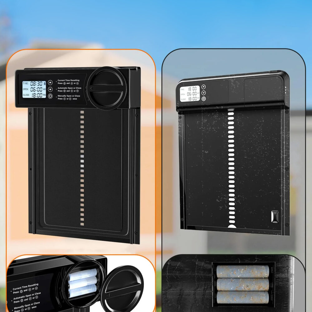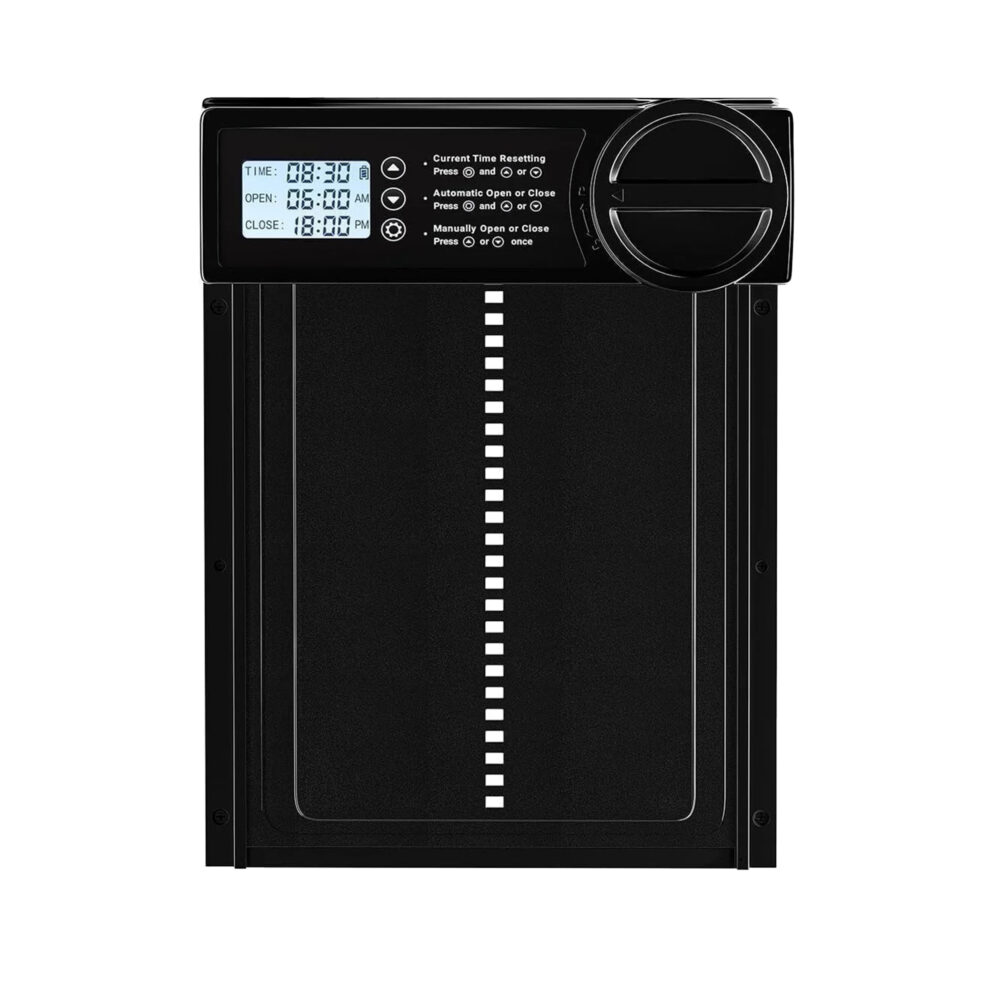 Zintegrowany ekran LCD umożliwia łatwą konfigurację godziny otwierania i zamykania drzwi – bez potrzeby użycia dodatkowych urządzeń. Wskaźnik poziomu baterii informuje Cię, kiedy należy wymienić zasilanie, a szybki dostęp do komory z bateriami (z zamkiem obrotowym) umożliwia wymianę w zaledwie minutę.