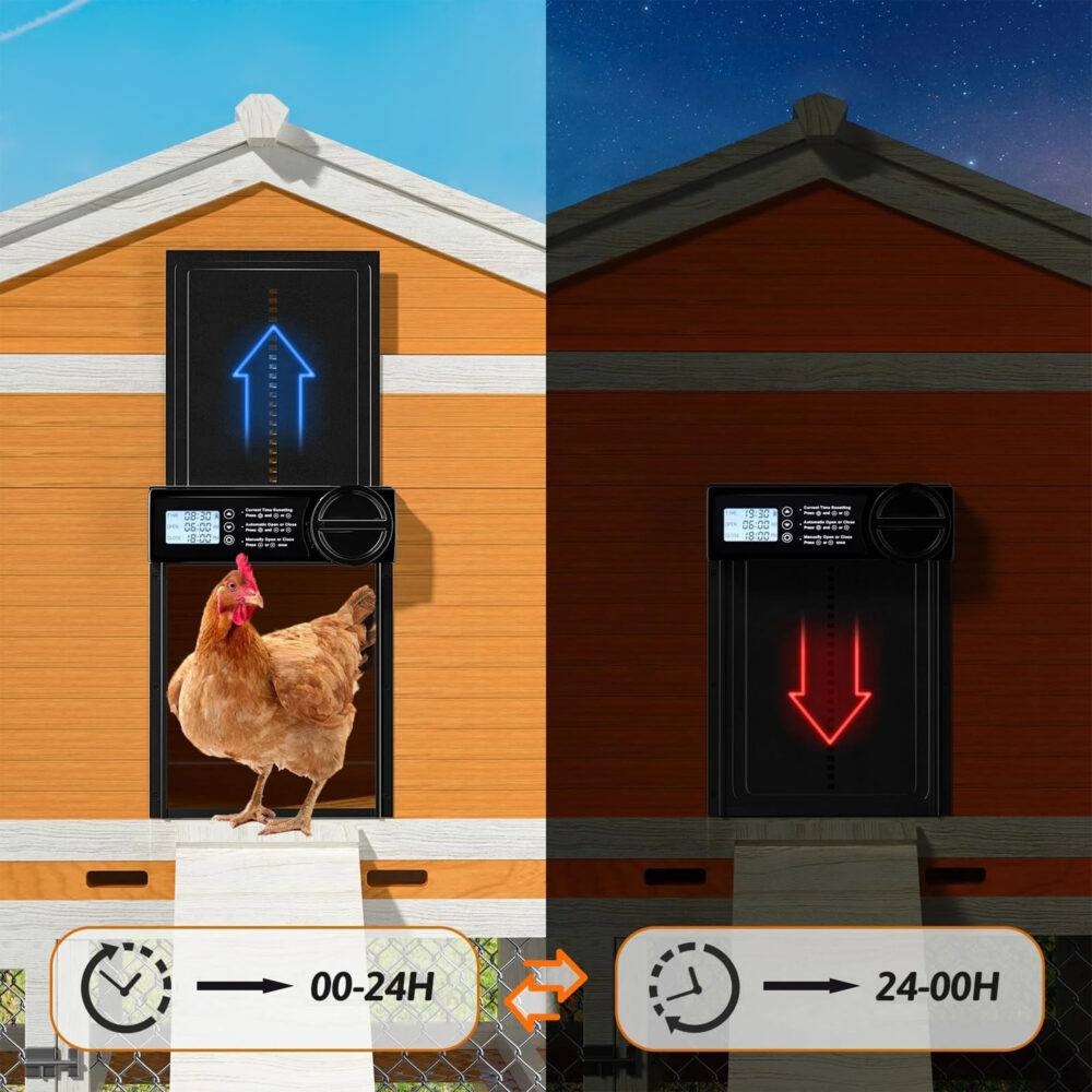 Zautomatyzuj codzienną opiekę nad drobiem. Dzięki dokładnemu timerowi drzwi otwierają się i zamykają o wybranej porze, zapewniając kurom bezpieczeństwo przed drapieżnikami i wygodny dostęp do wybiegu. System nie opiera się na czujnikach światła, co eliminuje błędne otwarcia spowodowane warunkami pogodowymi.
