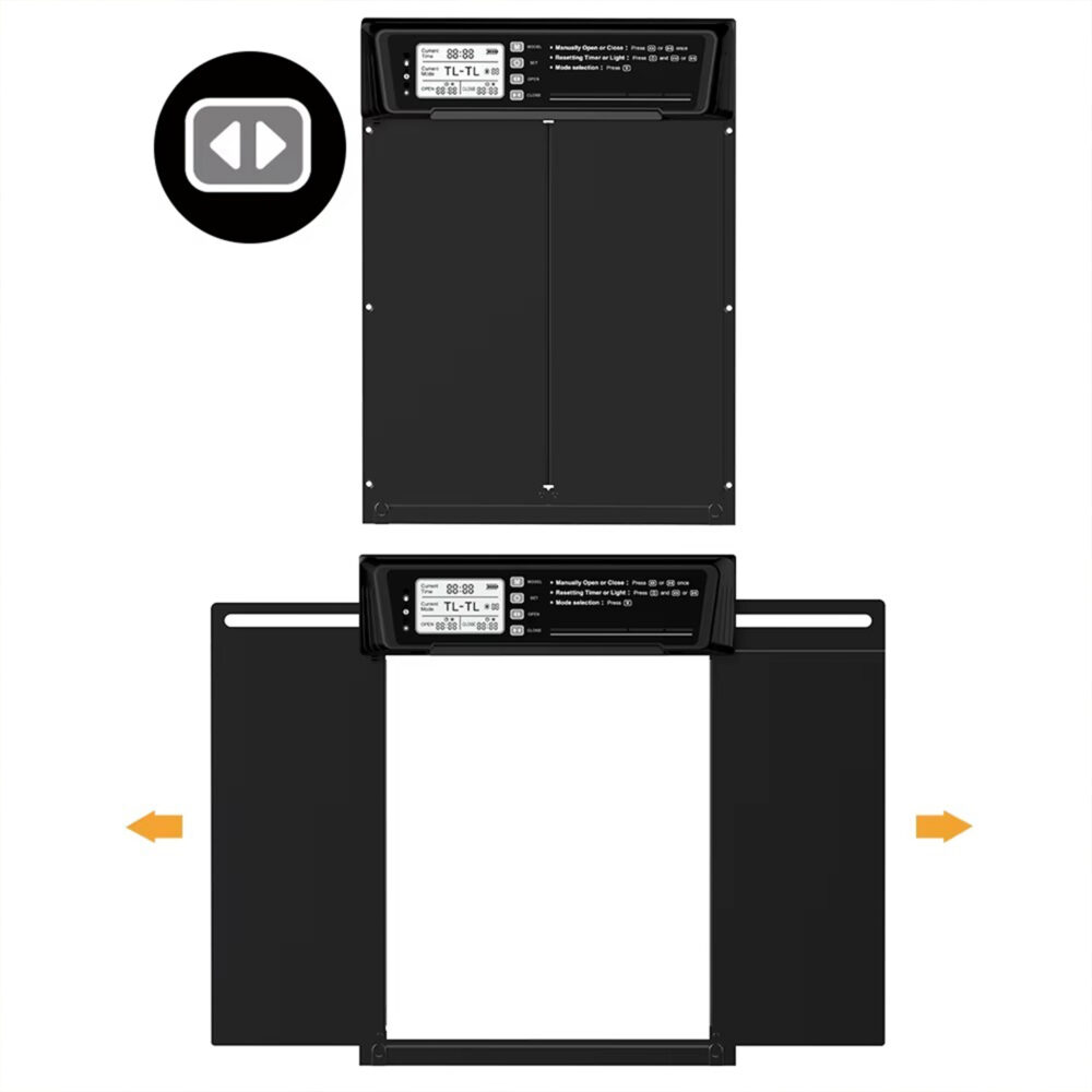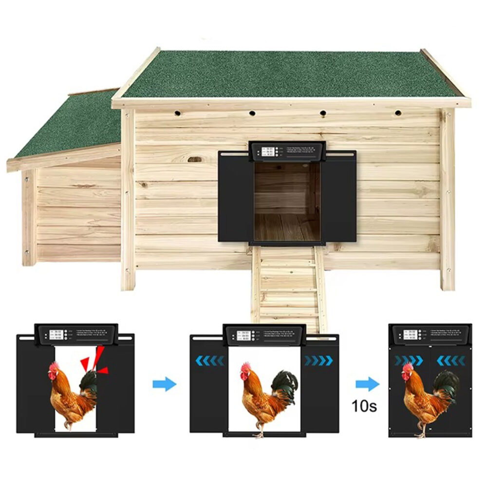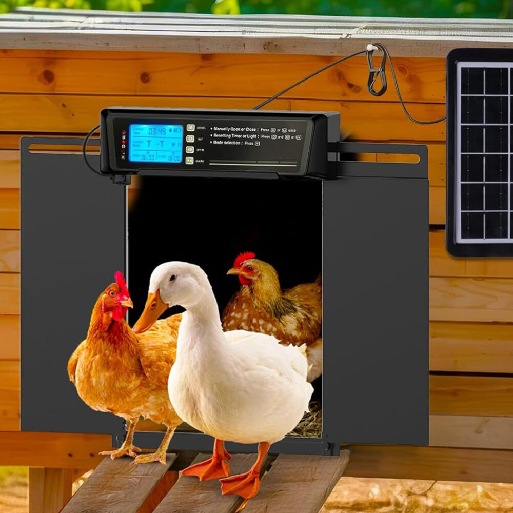 Automatyczne drzwi do kurnika z panelem solarnym – aluminiowa konstrukcja 37,9 × 28 cm, programator czasowy, czujnik światła, sterowanie pilotem.