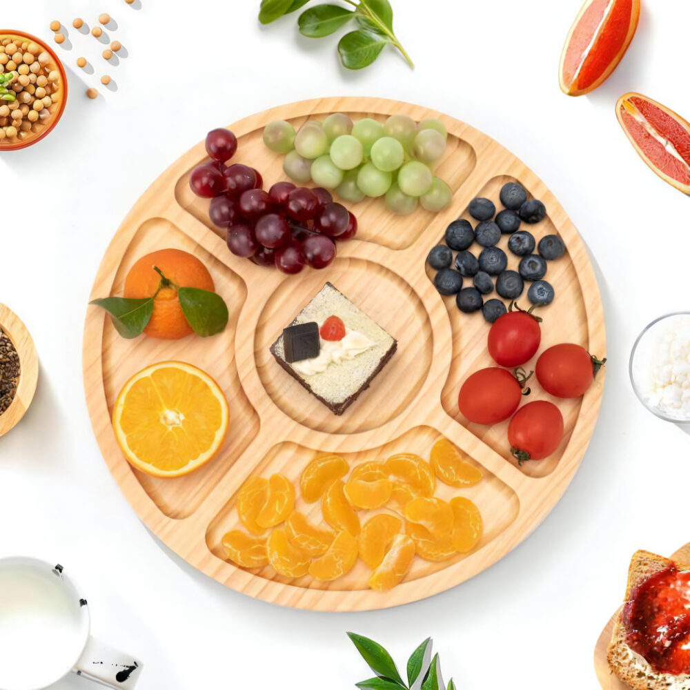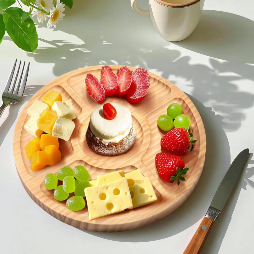 Deska posiada 5 osobnych przegródek, które umożliwiają estetyczne i higieniczne rozmieszczenie różnych produktów – od serów i wędlin po owoce i orzechy – bez ryzyka mieszania smaków.