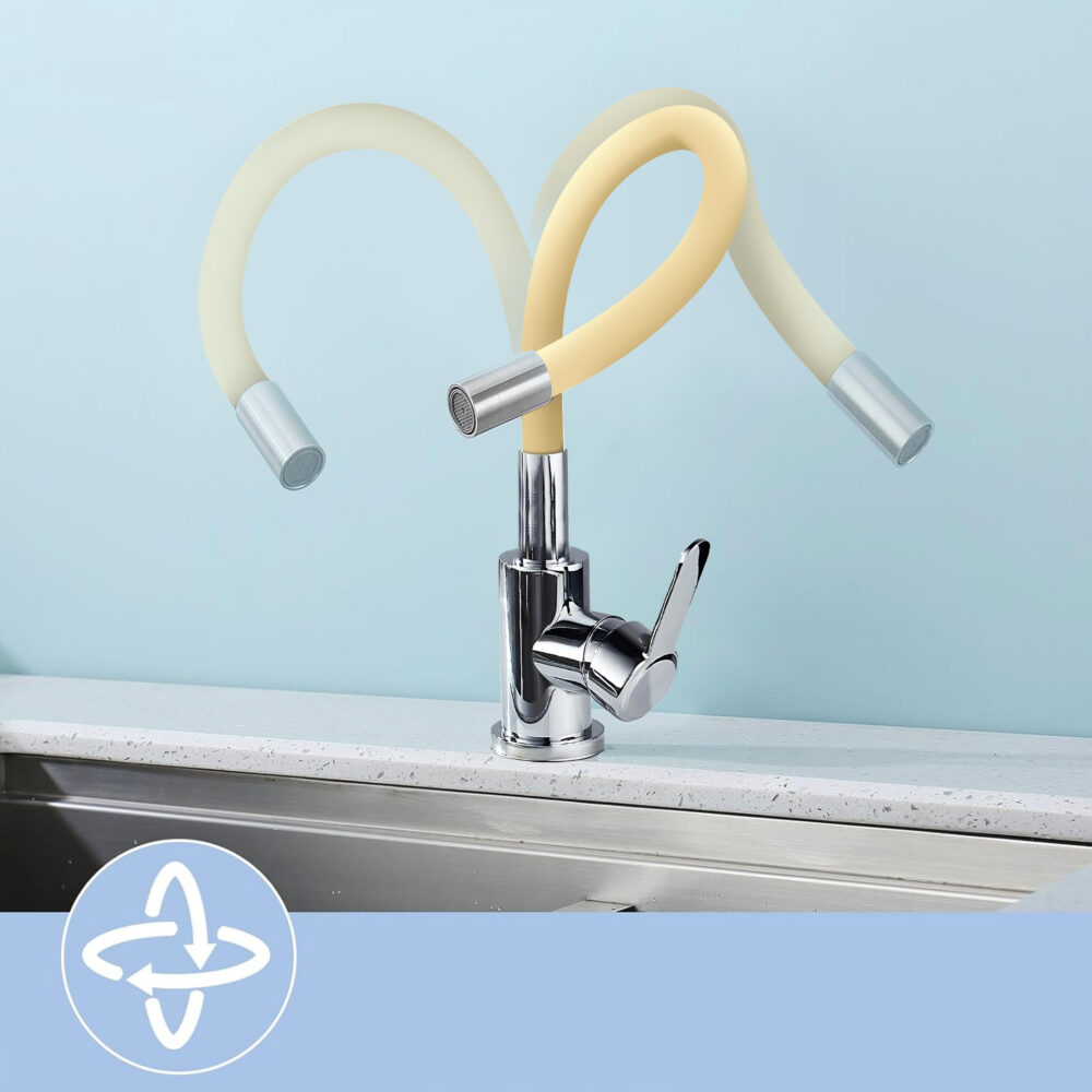Elastyczna szyjka kranu pozwala Ci na jej dowolne ułożenie oraz obrót dookoła własnej osi – dzięki czemu bez problemu napełnisz wodą czajnik, garnek, czy podlejesz rośliny.