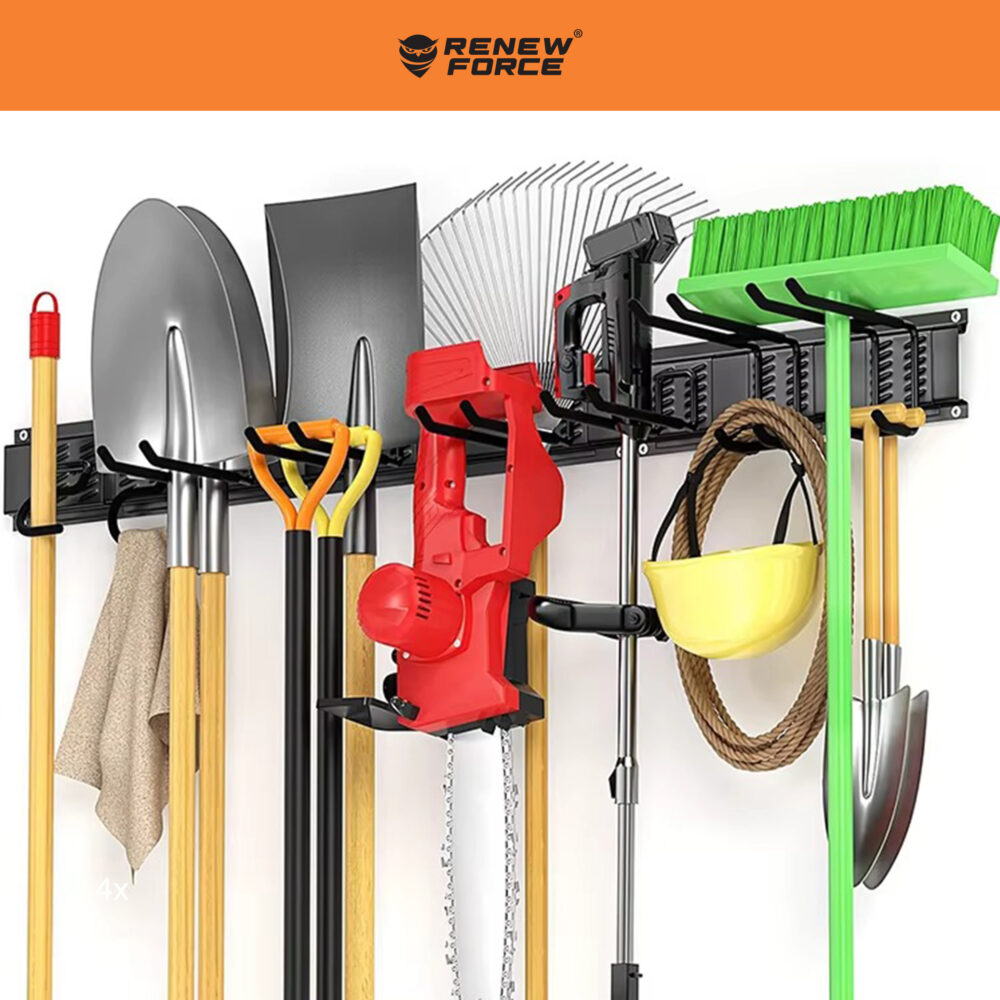 Regulowane haki można swobodnie przesuwać wzdłuż listwy, co pozwala dostosować układ do indywidualnych potrzeb. Organizer sprawdzi się zarówno do dużych narzędzi ogrodowych, jak i mniejszych akcesoriów.