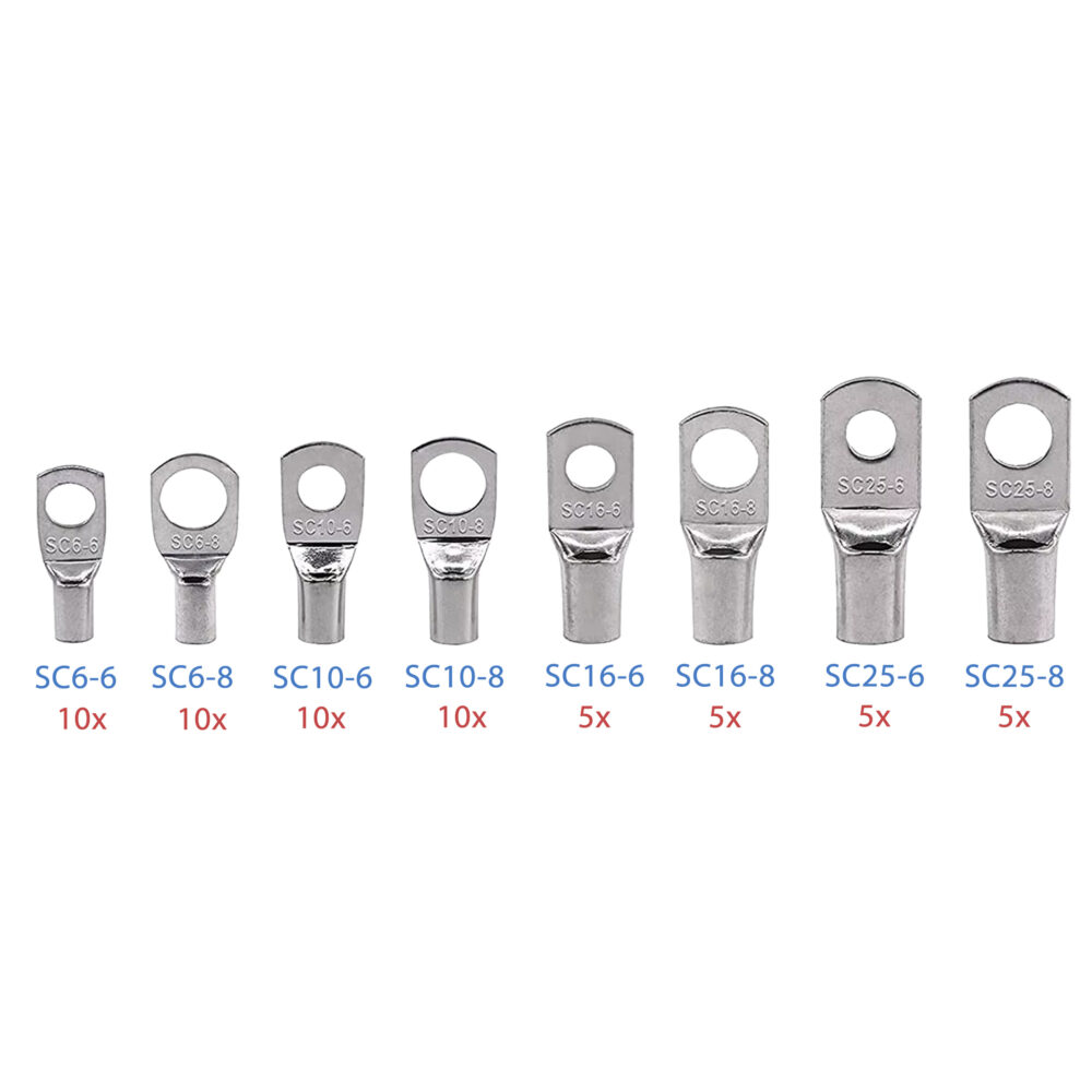 Końcówki kablowe zastosowane w tym zestawie są wykonane z miedzi — materiału cenionego za wysoką przewodność elektryczną i dobrą odporność na korozję.