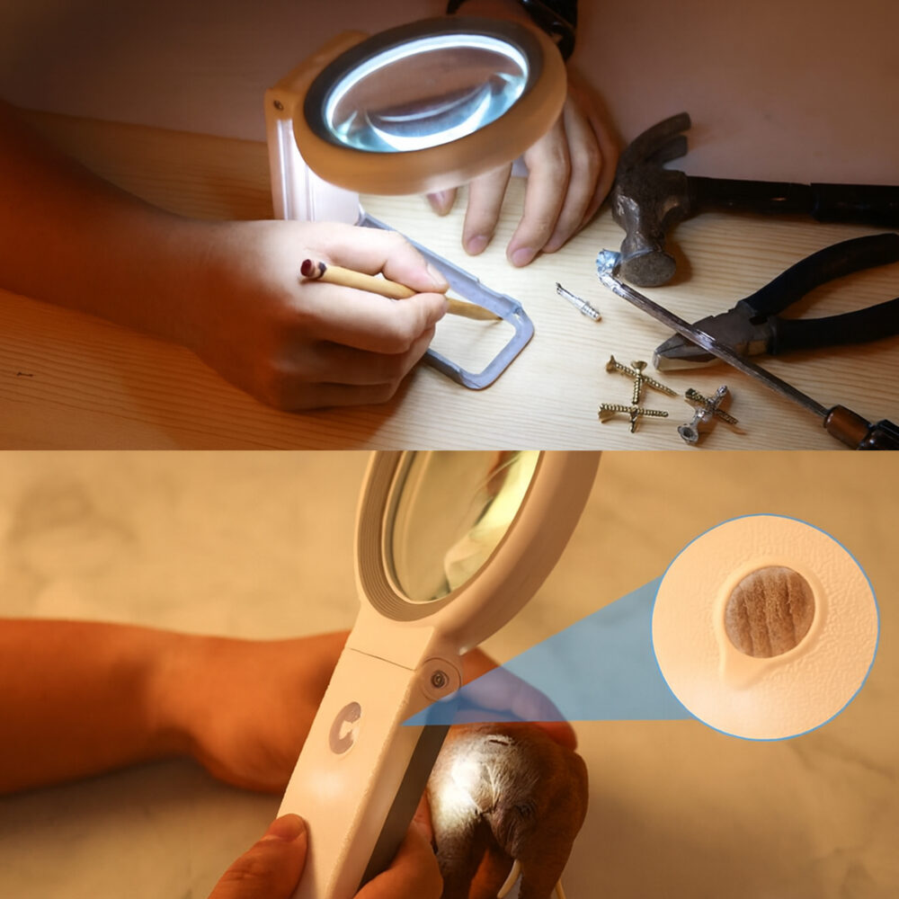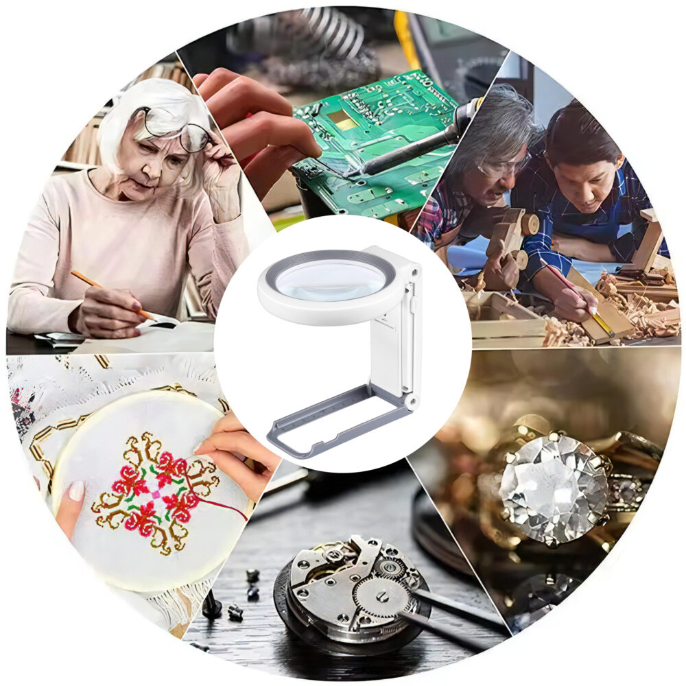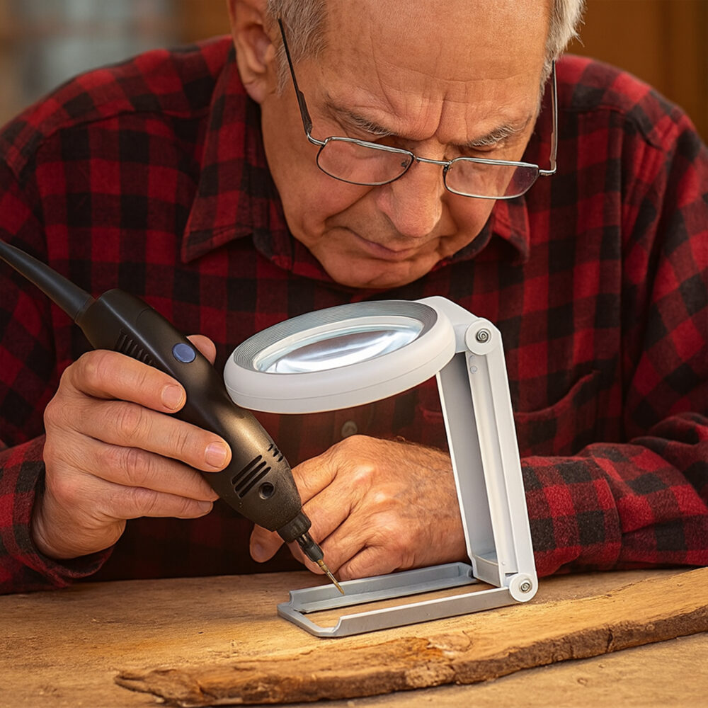 Kiedy chcesz mieć wolne ręce, rozłóż lupę na stabilnej podstawce i pracuj wygodnie: szycie, igłowanie, puzzle, naprawy, modelarstwo. Po użyciu składasz ją w kilka sekund i odkładasz do szuflady.