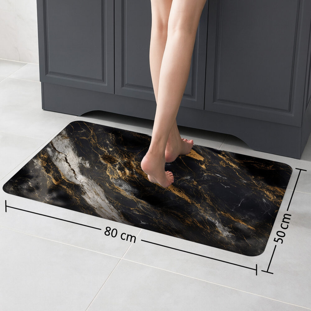 Jej elegancki marmurowy wzór sprawia, że łazienka nabiera luksusowego charakteru, a antypoślizgowy spód i szybkoschnący materiał gwarantują pełen komfort codziennego użytkowania.