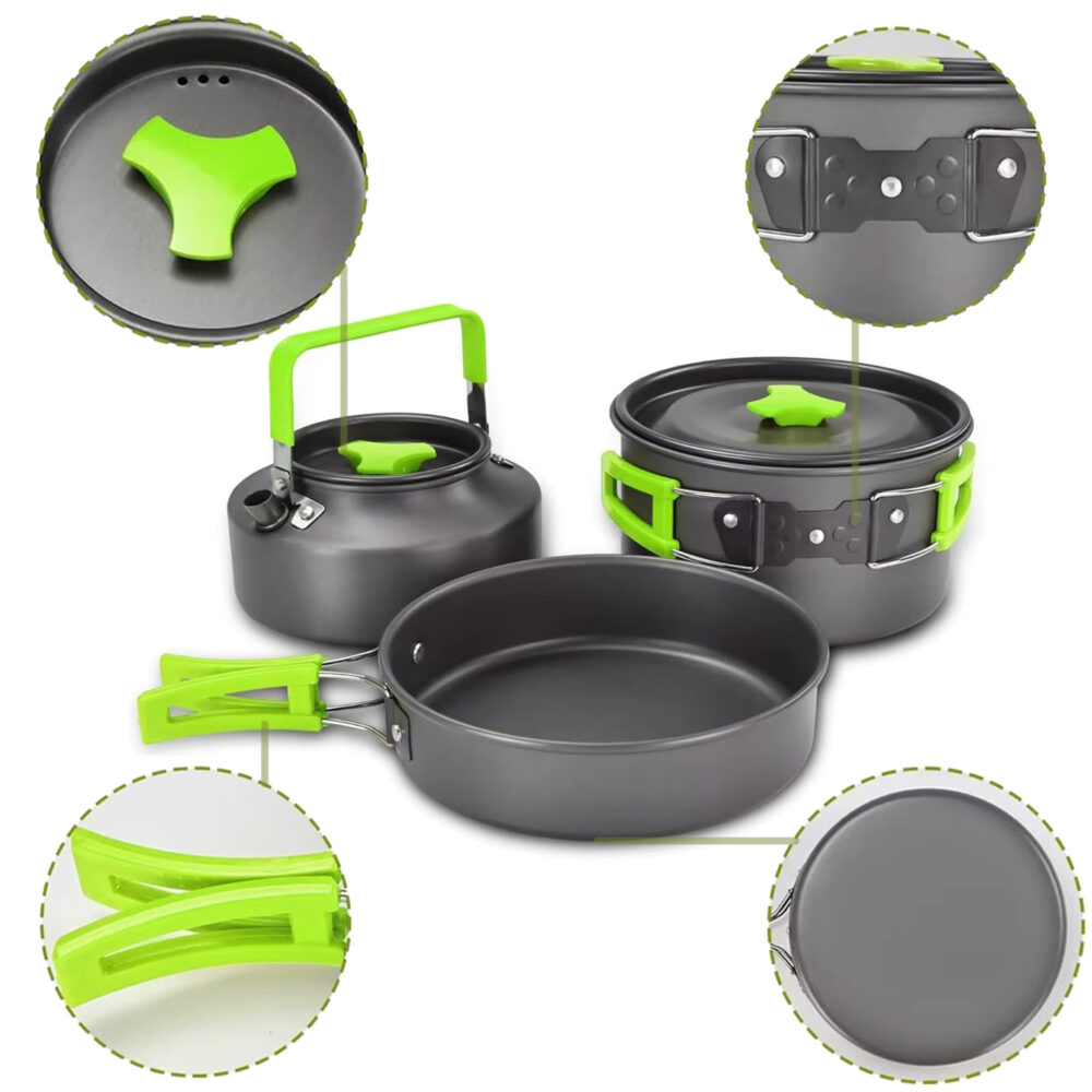 - Kompletny zestaw 8 elementów: garnek, patelnia i czajnik, pojemniki, łyżka, ściereczka — wszystko w jednej torbie
