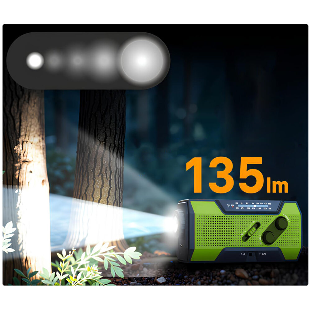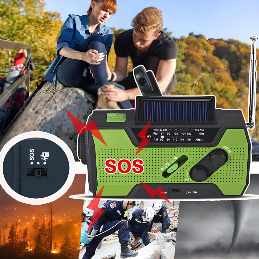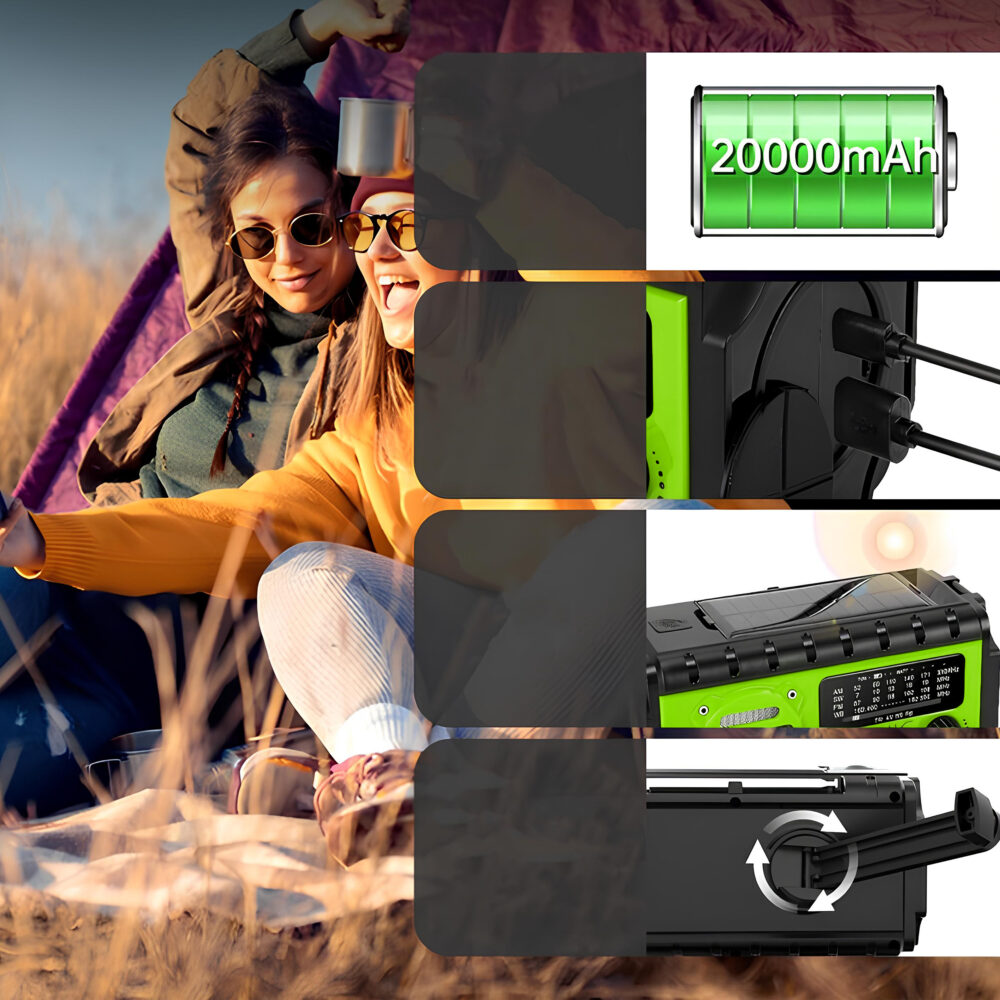 To nie tylko radio — to mobilne narzędzie przetrwania, które łączy energię słoneczną, dynamo, powerbank, latarkę LED oraz alarm SOS w jednym kompaktowym urządzeniu.
