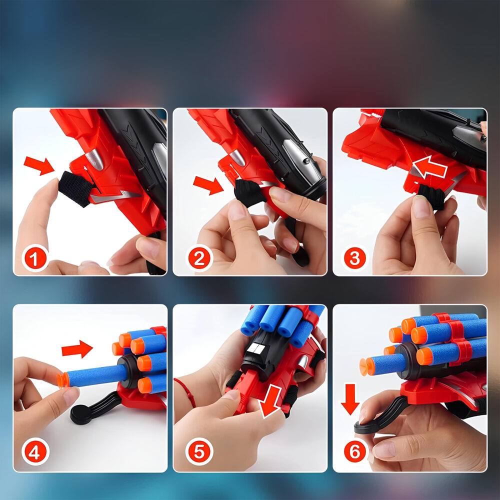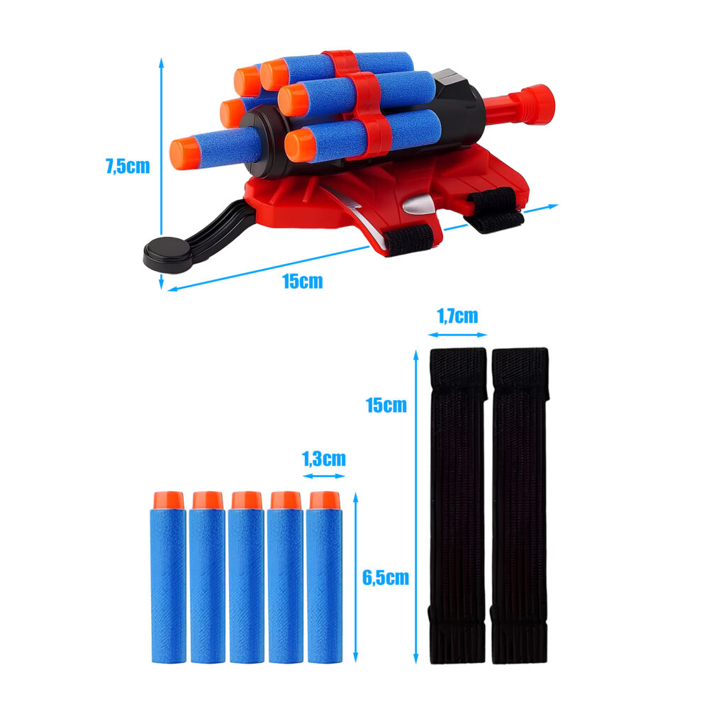 Na nadgarstku umieszczono lekką wyrzutnię, z której dziecko może strzelać dołączonymi pociskami. Mechanizm jest prosty i bezpieczny – wystarczy nacisnąć przycisk lub wykonać ruch dłonią, by pocisk poleciał w kierunku celu. Zabawka nie wymaga baterii, dzięki czemu działa zawsze i wszędzie.