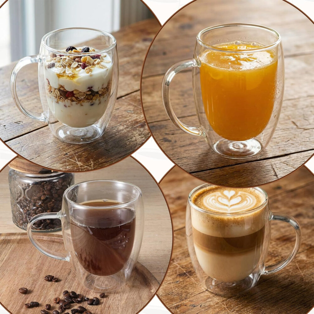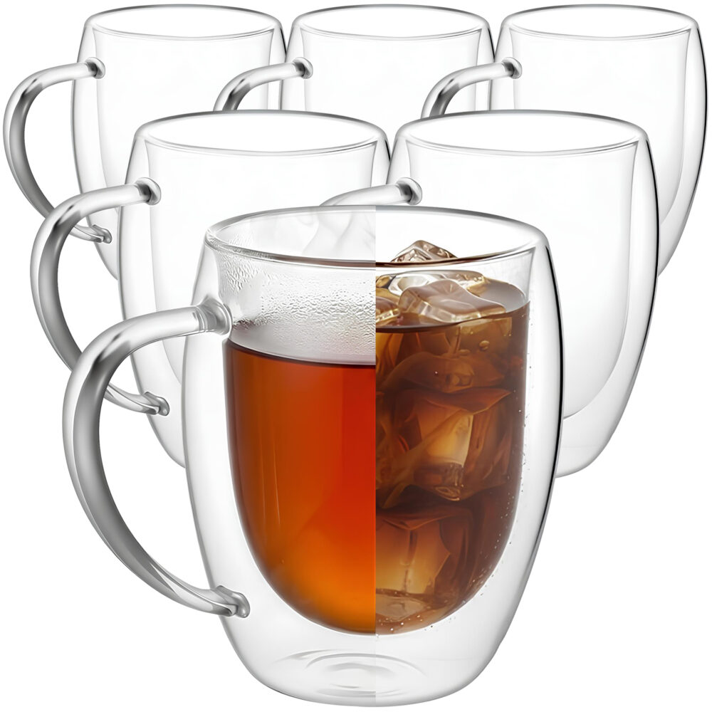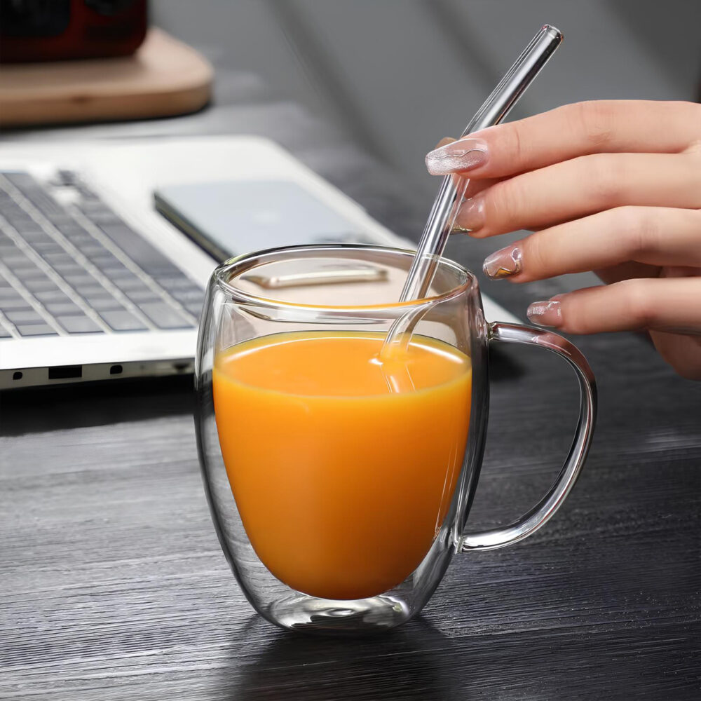 Podwójna konstrukcja tworzy warstwę izolacyjną, która ogranicza utratę temperatury. Gorąca kawa pozostaje dłużej aromatyczna, a mrożona herbata czy lemoniada utrzymuje przyjemny chłód bez efektu „mokrej szklanki” na stole. To rozwiązanie, które realnie podnosi komfort użytkowania.
