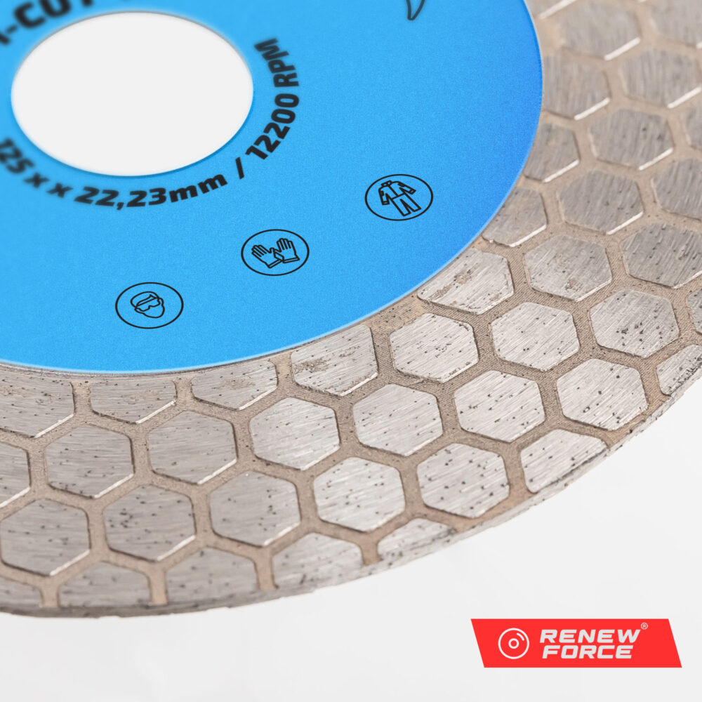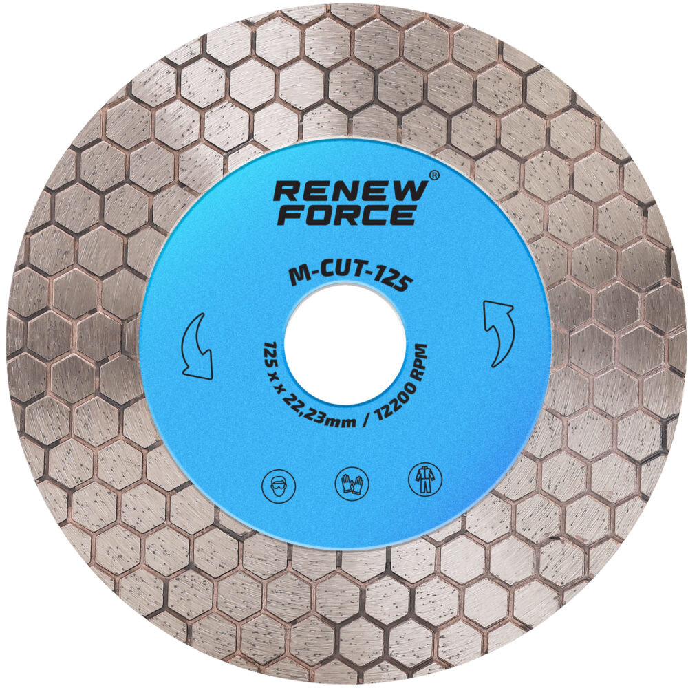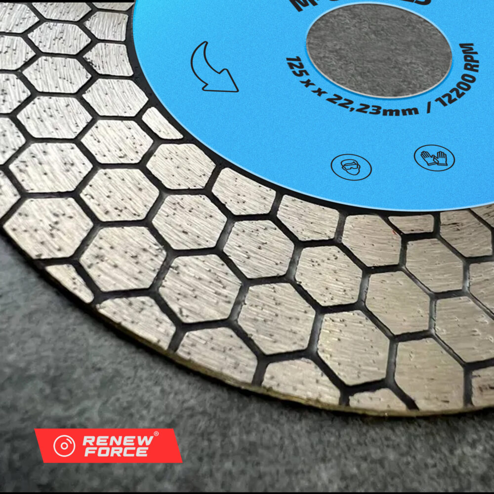 Profesjonalna tarcza diamentowa RENEW FORCE o średnicy 125 mm, wyposażona w dwustronną warstwę diamentową, to narzędzie zaprojektowane do wyjątkowo precyzyjnego cięcia oraz szlifowania nawet najtwardszych materiałów. Jej charakterystyczna konstrukcja typu „plaster miodu” zapewnia maksymalną stabilność i skuteczność podczas pracy.