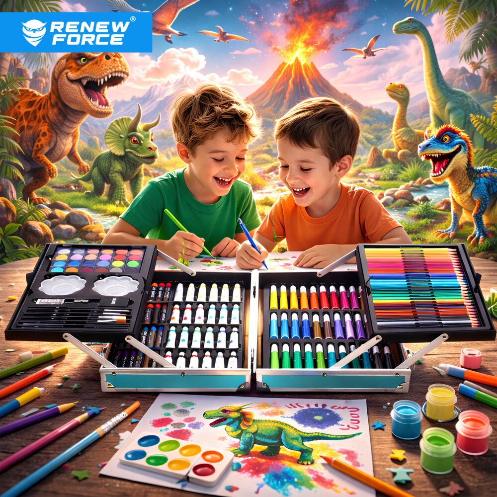 Profesjonalny zestaw artystyczny 145 elementów RENEW FORCE® w bajkowej walizce z motywem dinozaurów – wszystko, czego potrzeba do twórczej zabawy i rozwoju talentu.