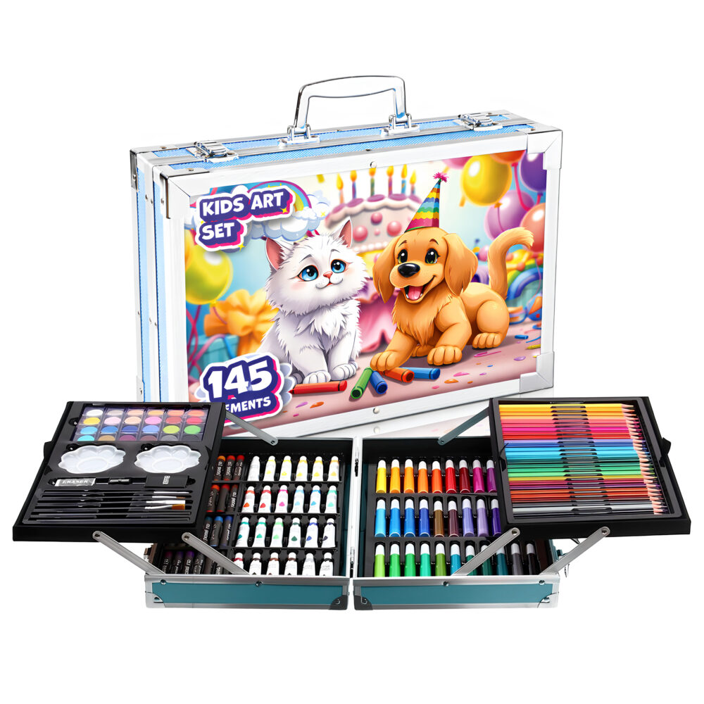 Profesjonalny zestaw artystyczny 145 elementów RENEW FORCE® w bajkowej walizce z motywem kotków i piesków – wszystko, czego potrzeba do twórczej zabawy i rozwoju talentu.